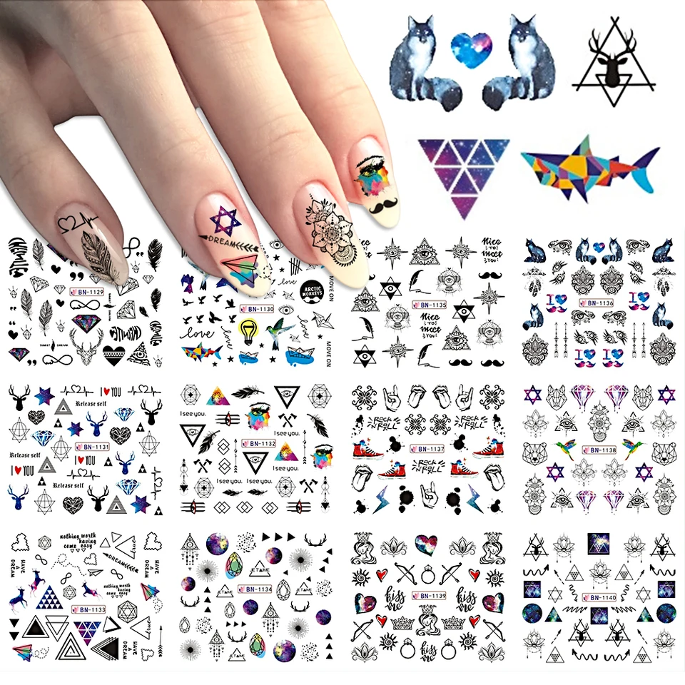 12pcs Nail Water Stickers Galaxy Wraps Jewelry Flowers Adhesive (12pcs Nail Water Stickers Galaxy Wraps Jewelry Flowers Adhesive Geometry Black Watercolor Image Manicure Tools BEBN1129-1140)