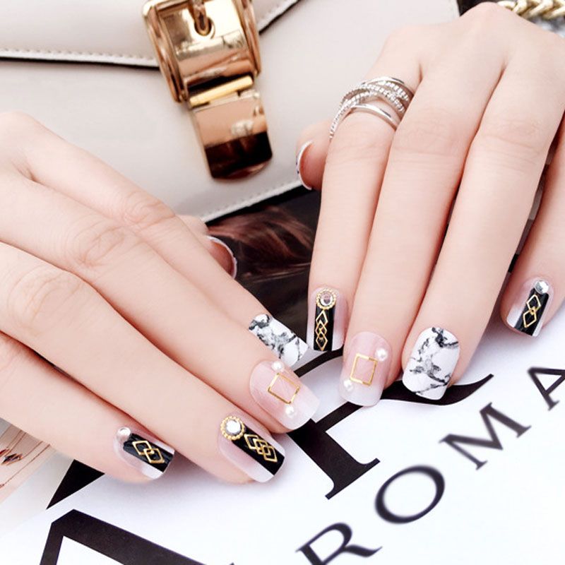 Kupit Optom Zhou 24 Sht Kompl Chernyj Korotkie Nakladnye Nogti (Купить Оптом ZHOU 24 Шт./Компл. Черный Короткие Накладные Ногти Мраморные Текстуры И Заклепки Мода Дизайн Накладные Ногти Лето Полное Покрытие ...)