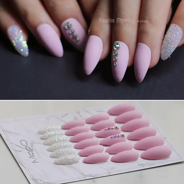 Medium Stiletto Nails 24pcs Pink False Nails Rhinestone Laser (Smarter Shopping, Better Living! Aliexpress.com)
