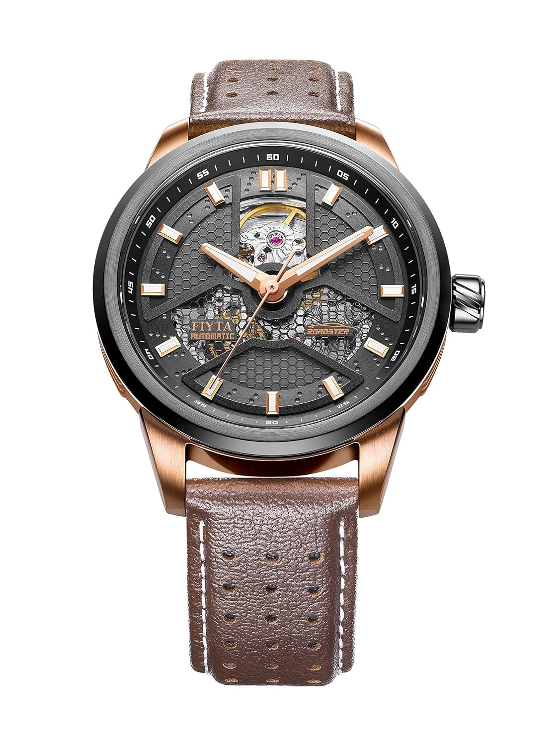 Amazon Com Fiyta Extreme Automatic Black Dial Men S Watch (Rose gold PVD stainless steel case with a brown leather strap. Fixed black ion-plated bezel. Black Y-shaped skeleton dial with luminous rose gold-tone ...)