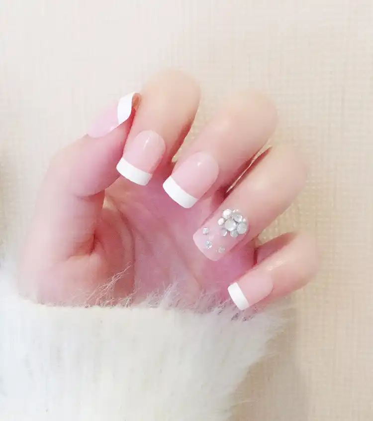 24 Sht Naturalnye Francuzskie Korotkie Nakladnye Nogti So Strazami (24 шт Натуральные Французские короткие накладные ногти со стразами Акриловые классические полностью искусственные ногти для домашнего офиса ...)