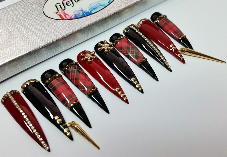 Red And Black Tartan Stiletto Nails With Gold Crystals And Etsy (Red and Black Tartan Stiletto Nails with gold crystals and studs, press on nails, false nails, glue on nails, custom nails)