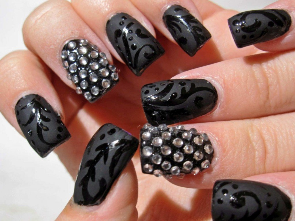 черный дизайн ногтей со стразамиСсылка: